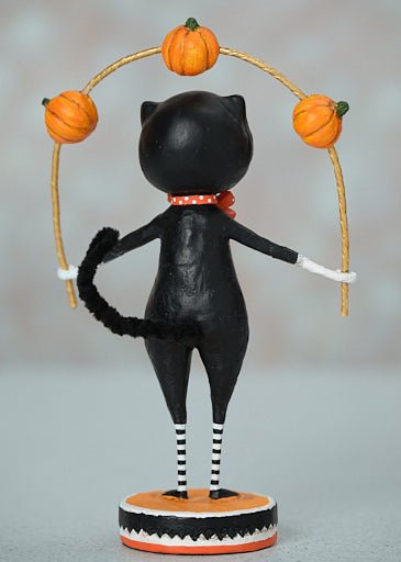 This adorable figure by Lori Mitchell will bring joy and entertainment to your Halloween festivities. With her charming tuxedo cat costume and playful spirit, she effortlessly juggles pumpkins with the confidence of a circus star.