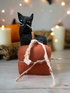 Standing 10” tall, This Black Cat is accompanied by soft felt Pumpkin, each with unique color variations that add to their handcrafted appeal.